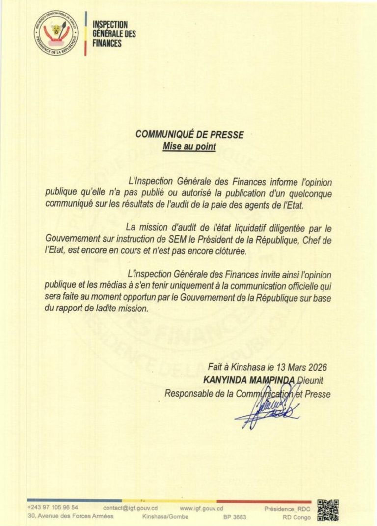 Dans cette mise au point, l’Inspection Générale des Finances précise qu’elle n’a ni publié ni autorisé la diffusion d’un quelconque communiqué relatif aux résultats de cette mission d’audit, appelant à la prudence face aux informations relayées dans certains espaces médiatiques.